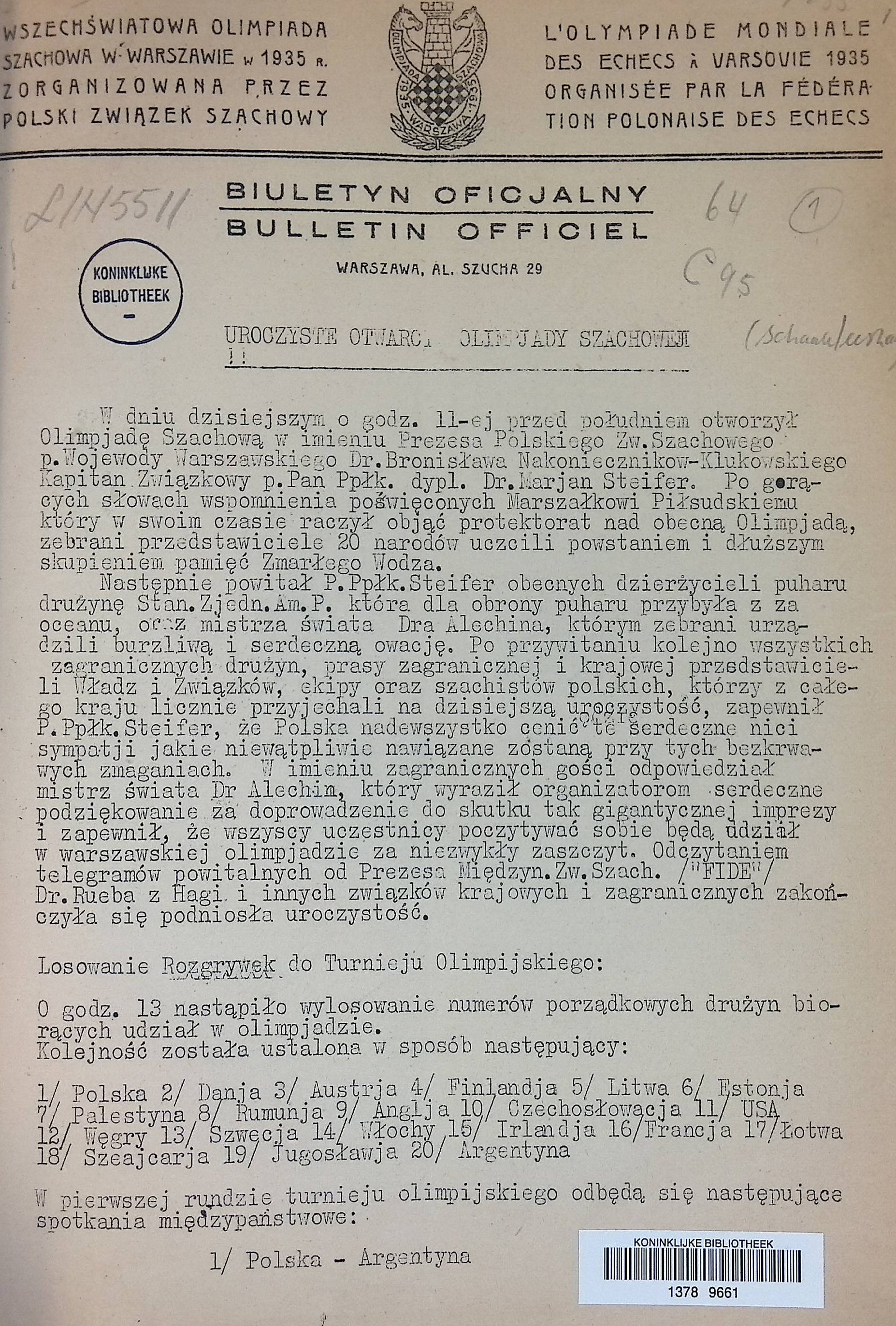 Bulletin of 1935 Chess Olympiad in Warsaw