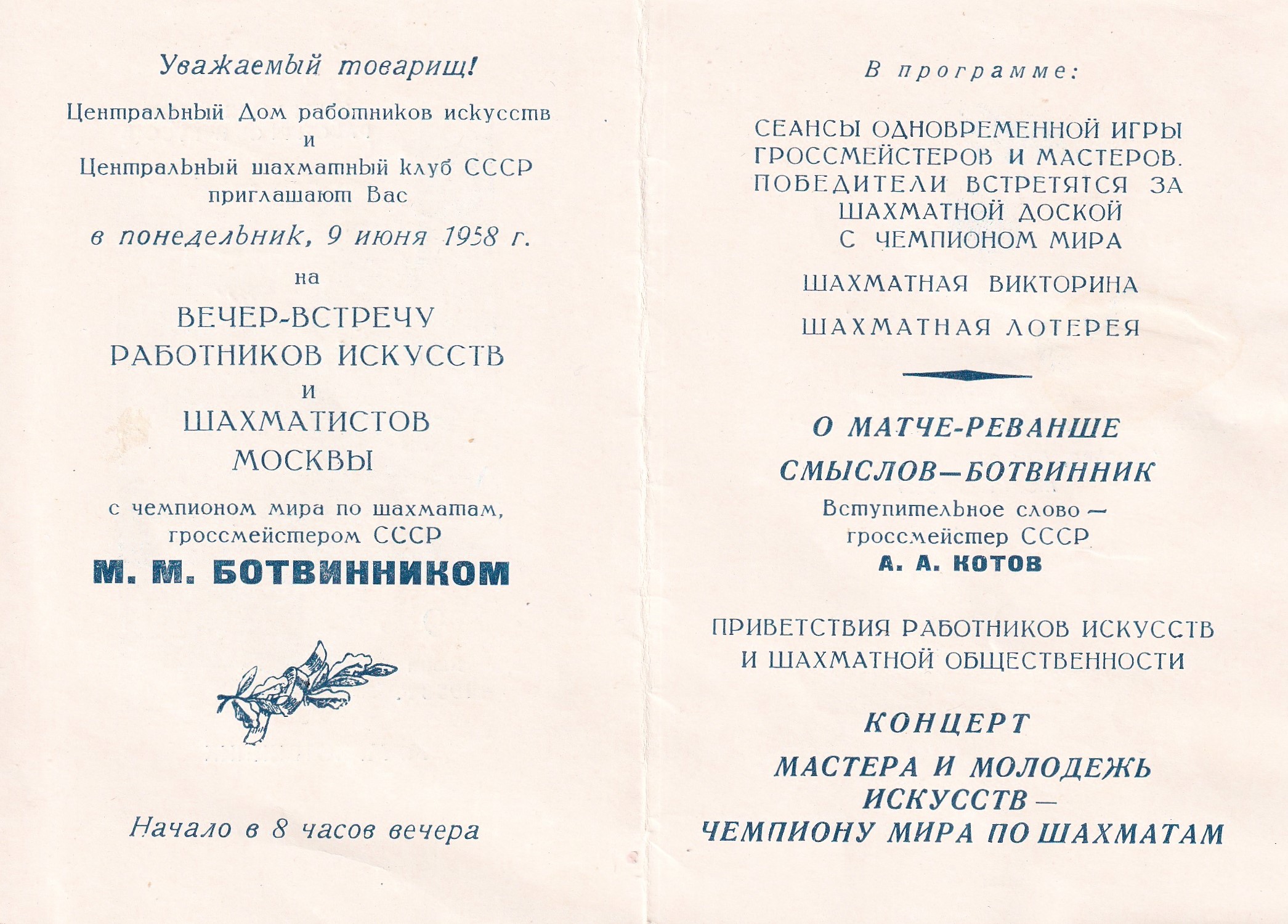Invitation to the meeting with World Chess Champion Botvinnik