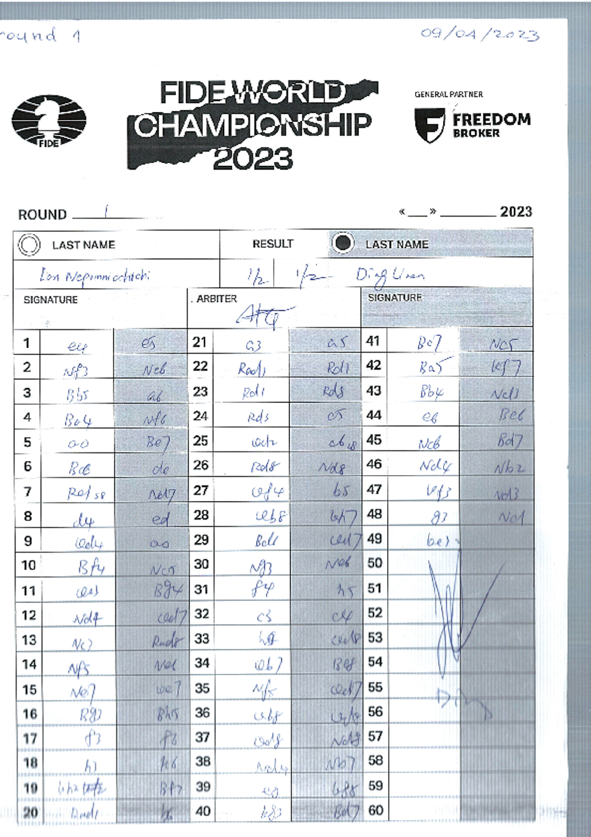 Scoresheet of Game 1 of the 2023 World Championship Match between Ding Liren and Ian Nepomniachtchi