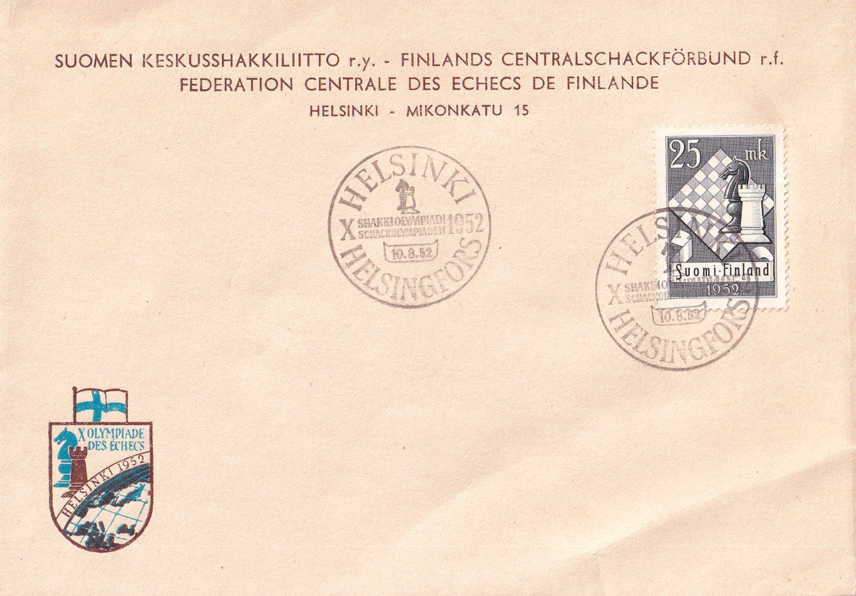 Envelope, stamp and cancellation dedicated to the 1952 Chess Olympiad