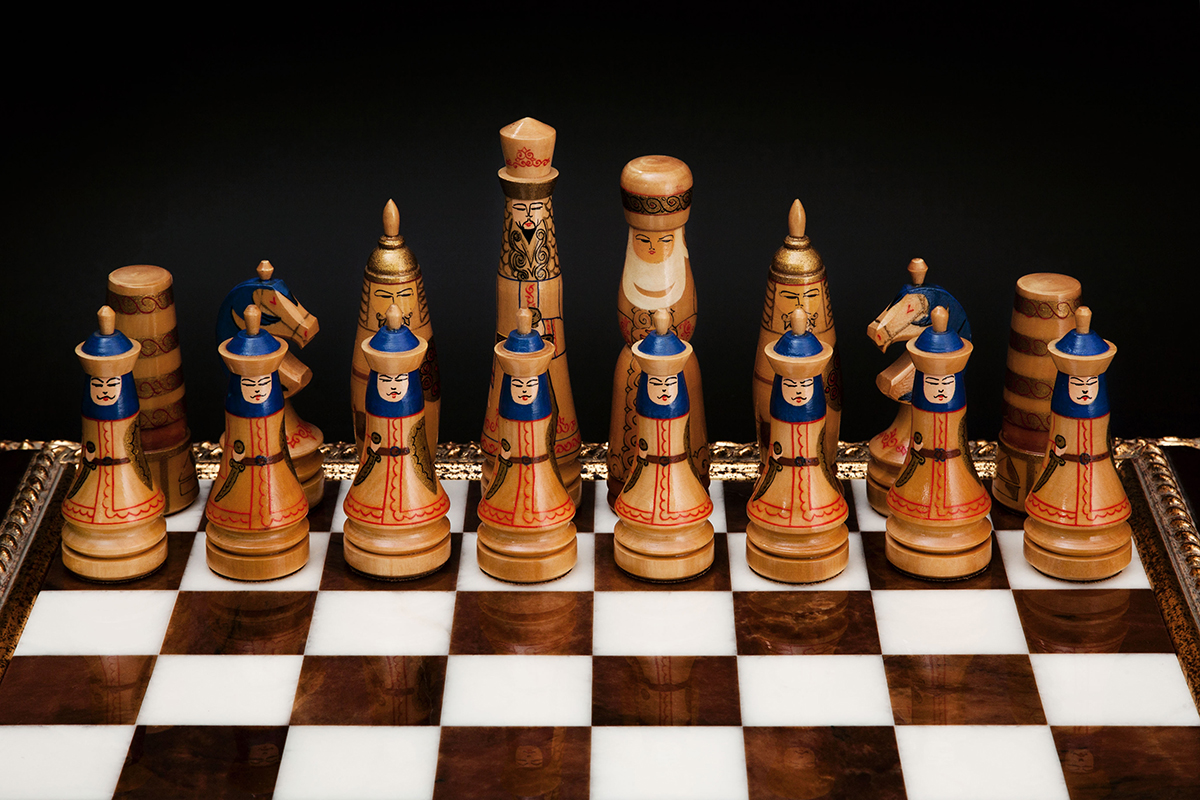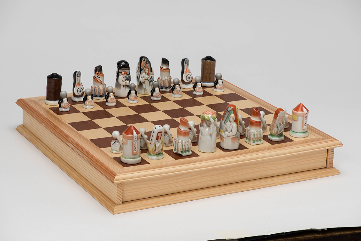 The set's bronze pieces depict unknown deities and strange animals. This exotic African chess set was offered to the USSR Chess Federation by visitors from Burkina Faso (then the Republic of Upper Volta) in 1972. It is a mystery to anthropologists and cultural scientists. Whom do the pieces portray? Why are humans, animals, deities (or perhaps spirits) side by side on the chessboard? Why is the tallest figure a boat with the mysterious “antennas”? Nothing is explained, the mystery persists and fascinates…