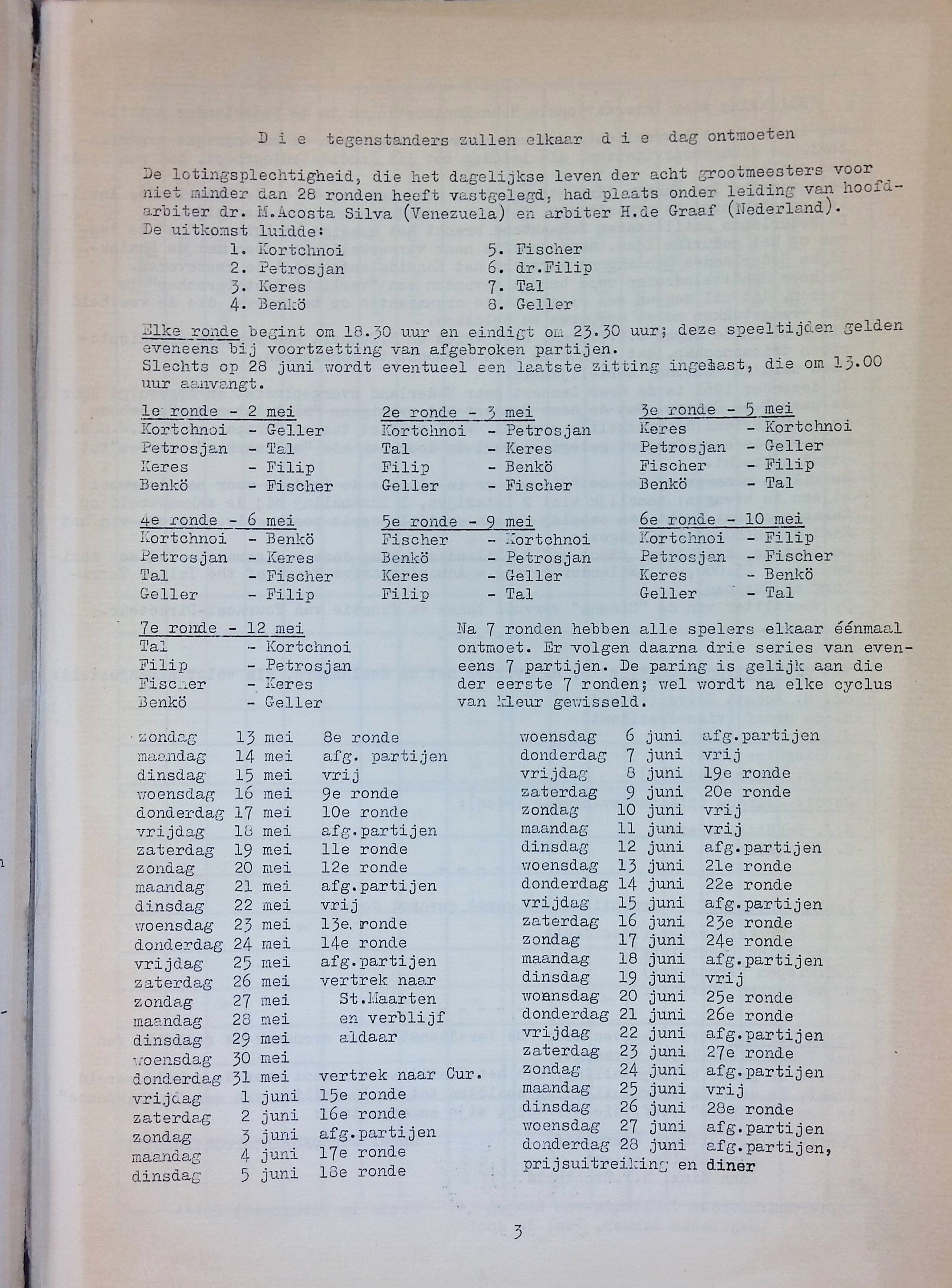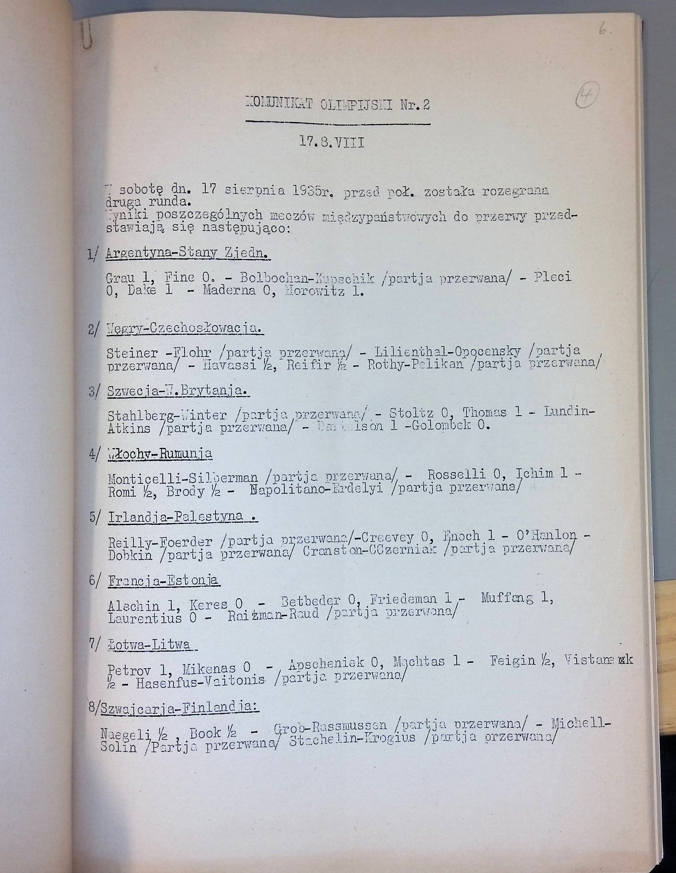 A bulletin published at the 6th Chess Olympiad in Warsaw, Poland, containing technical information about the tournament such as standings, pairings, schedules, and distributed among the participants.