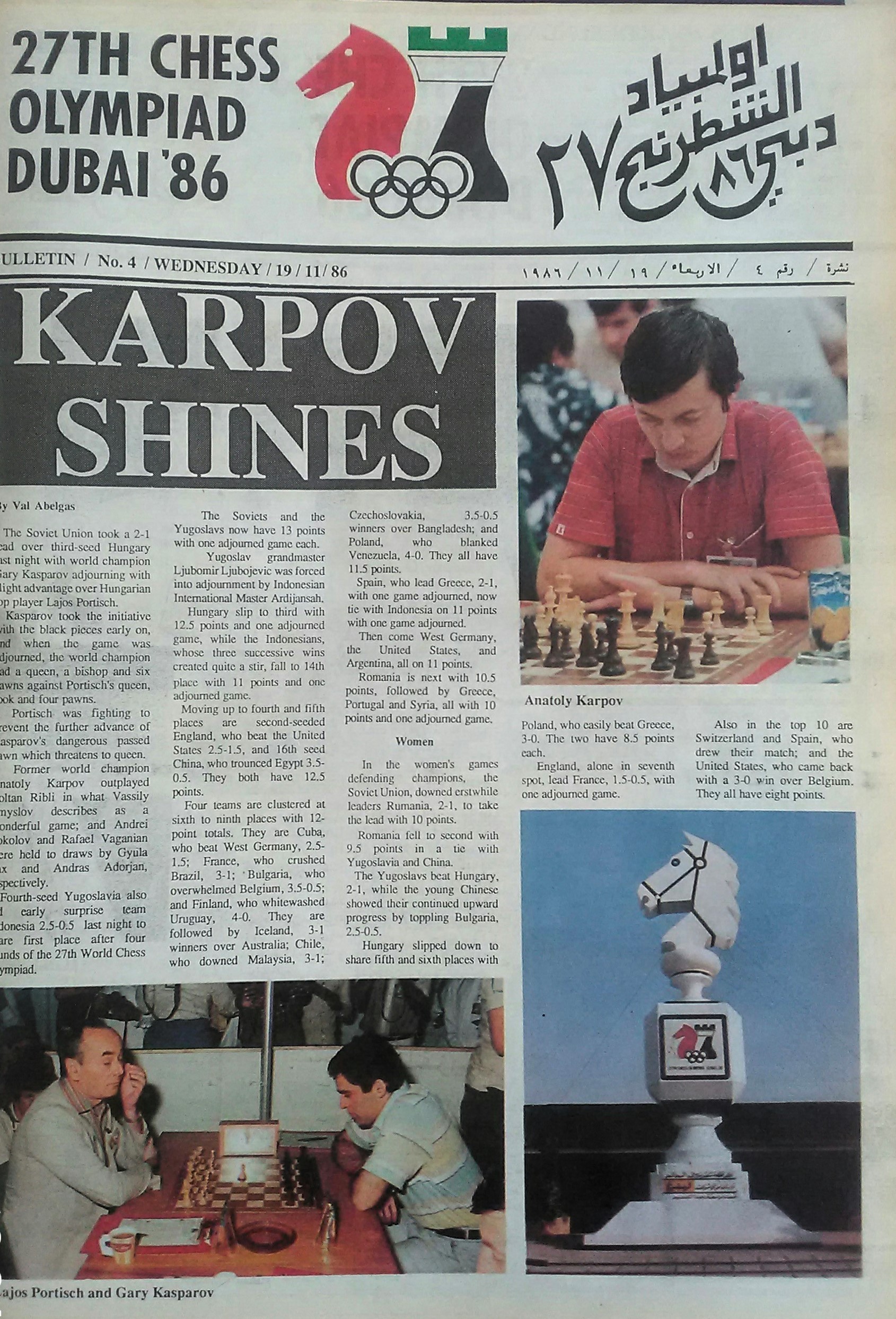 The 27th Chess Olympiad took place between November 14 and December 2, 1986, in Dubai, United Arab Emirates. For the first time, the number of participants in the Open tournament reached triple digits, with 108 teams taking part. In the Women’s Olympiad, 49 teams participated. The Soviet Union triumphed in both tournaments.The Olympiad bulletin served as a daily newspaper, containing information on standings, pairings, games, and articles about the event.