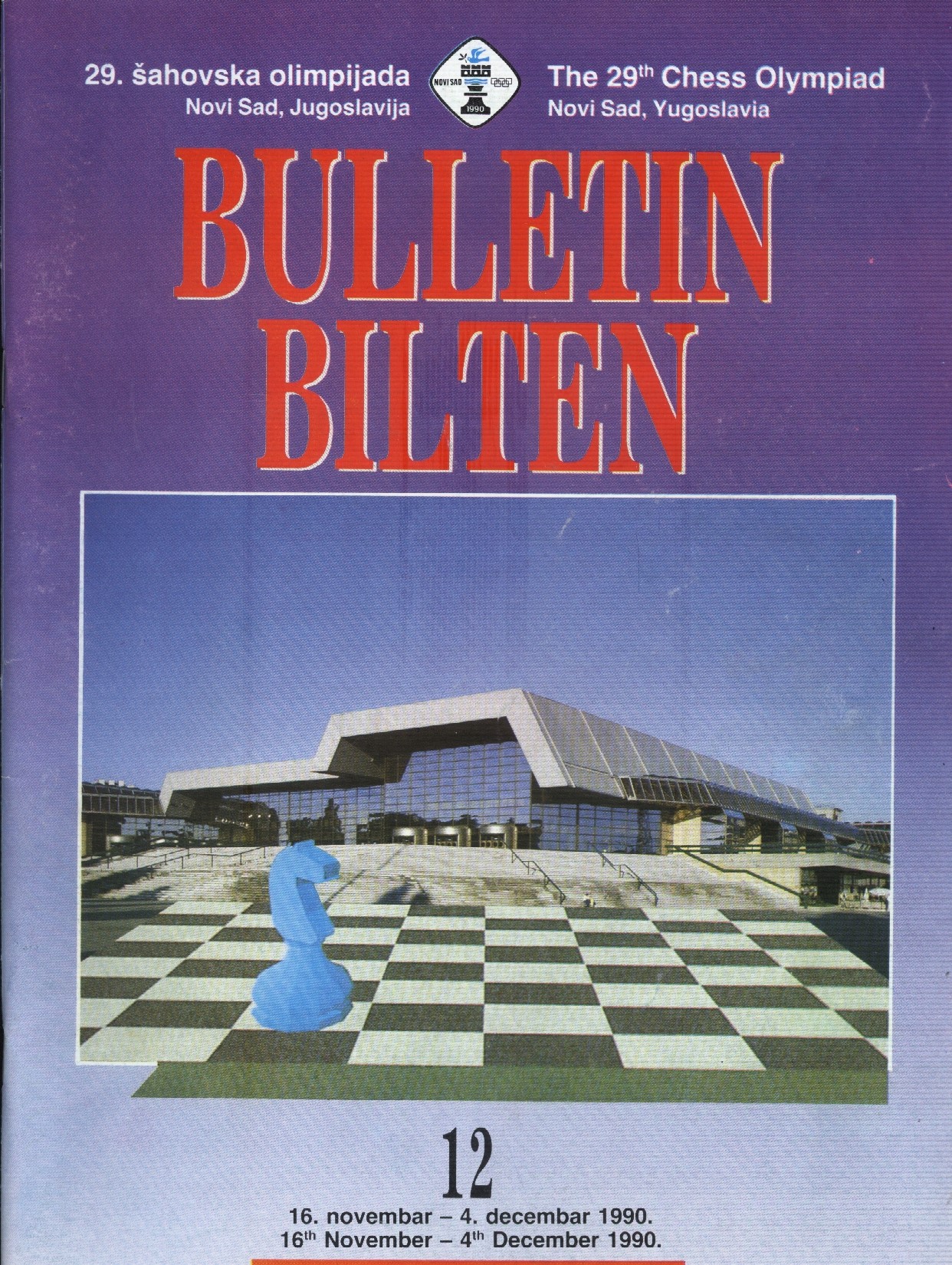 The 29th Chess Olympiad took place between November 16 and December 4, 1990, in Novi Sad, Yugoslavia (present-day Serbia). The Soviet Union finished in style by winning their sixth consecutive gold medals and 18th overall, even without Garry Kasparov and Anatoly Karpov, who were in the midst of their fifth and final world championship match. The United States secured silver, and England took bronze. In the women’s event, Hungary again bested the Soviet Union, although only on tiebreak this time. Once again, all three Polgár sisters (Zsuzsa, Zsófia, and Judit) were in the team - and they all won their respective boards. China came third.The daily bulletins helped participants and spectators follow the Olympiad: they contained results, pairings, games, and articles about the ongoing event.