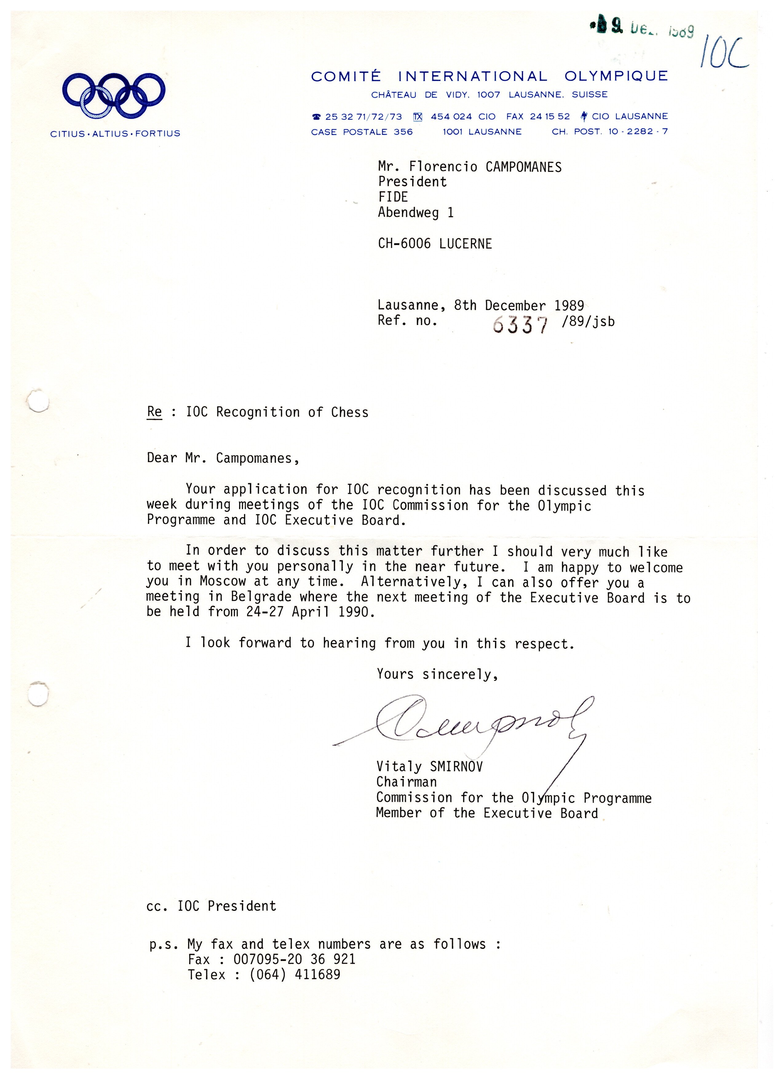 The International Chess Federation (FIDE) is recognized by the International Olympic Committee (IOC) as the supreme body responsible for organizing chess and its championships globally and at the continental level. This recognition was granted to chess in 1999 during the 109th session of the IOC in Seoul. FIDE President Florencio Campomanes initiated efforts for inclusion a decade earlier, and his successor, Kirsan Ilyumzhinov, continued the work. The certificate of recognition, signed by incumbent IOC President Juan Antonio Samaranch, designates chess as a sport and FIDE as its governing body.