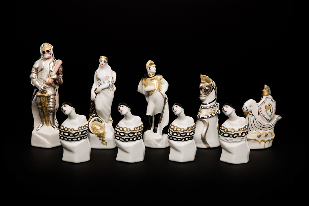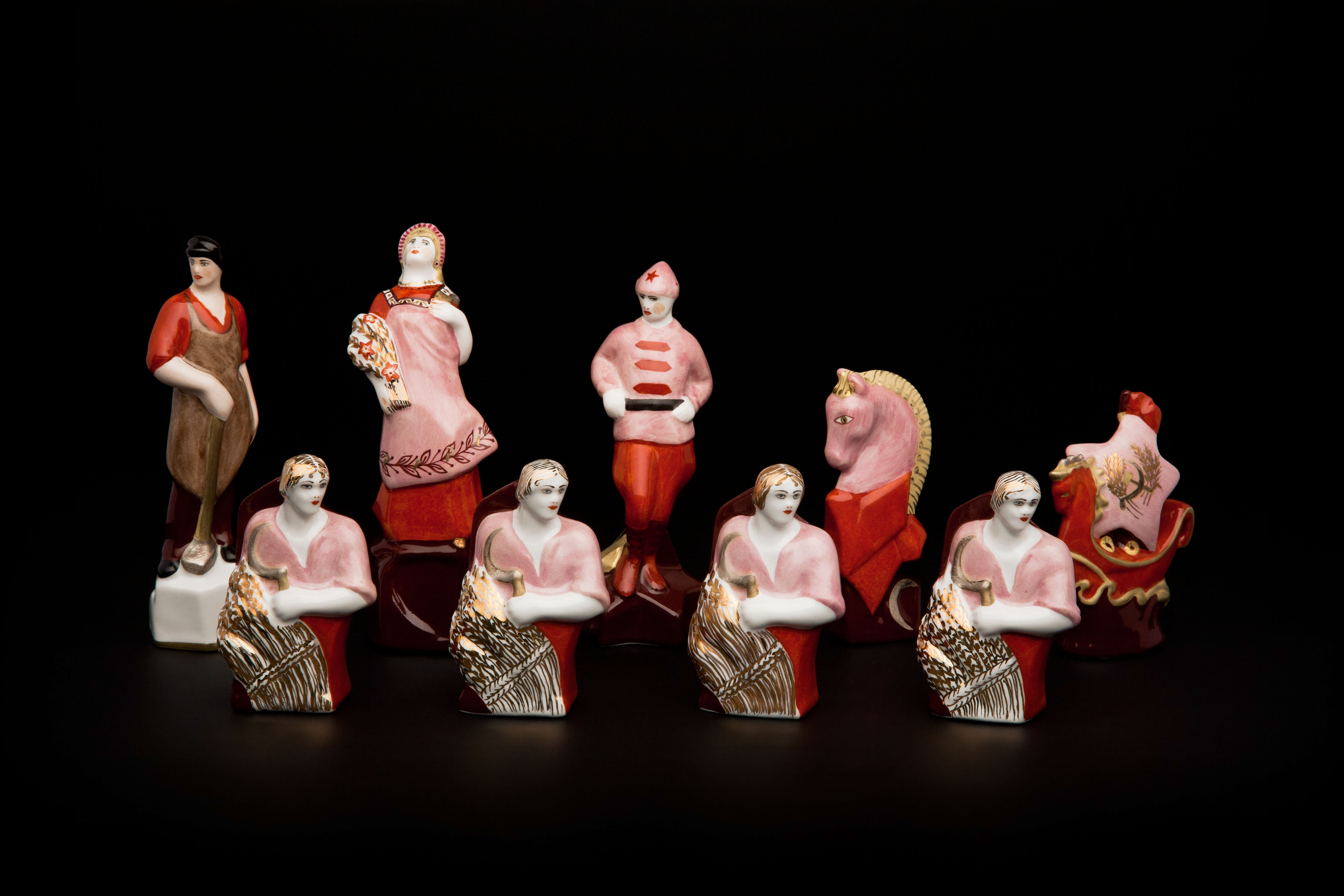 This chess set is the work of the renowned Soviet porcelain masters, sisters Natalia and Elena Danko. “The red” and “the white”, the exemplary “ours” and the evil “others”. The contrast is grotesquely exaggerated: on one side — the anguished looks of white “pawns” entangled in chains, on the other — enthusiastic eyes of red harvesters with golden sheaves. The topless white queen — a personification of vice — and a strong rosy-cheeked worker. The outlived monarch is replaced with a mighty muscular striker on the side of the Reds, and a death knight on the side of the Whites… Ironically, the set was eagerly sought after by representatives of the “old world” outside the borders of the “new world” of Soviet Russia.