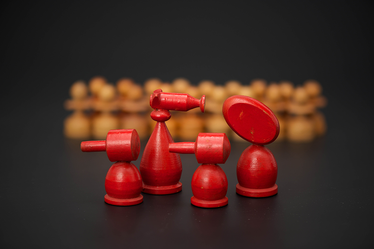 Next to the former bishops (now political instructors or minesweepers), knights (now cavalry soldiers) and rooks (now artillery) are 18 Red Army men (former pawns). Machine-guns cover the flanks. An airplane soars into the sky from one corner of the board, flying over both its own and enemy troops, and a tank bulldozes its way from the other corner, “making no distinction between colors”... Perhaps inspired by Victrix, some adopted “street versions” of standard chess rules: surrounded by four Red Army men, machine guns could be captured, while the tank that has made it to the last horizontal line entitled the player to add two men to the board. In addition, in case of victory (checkmate signified captivity of the enemy command center), the total value of the remaining pieces on the board was calculated: the more points scored, the more valuable the victory.